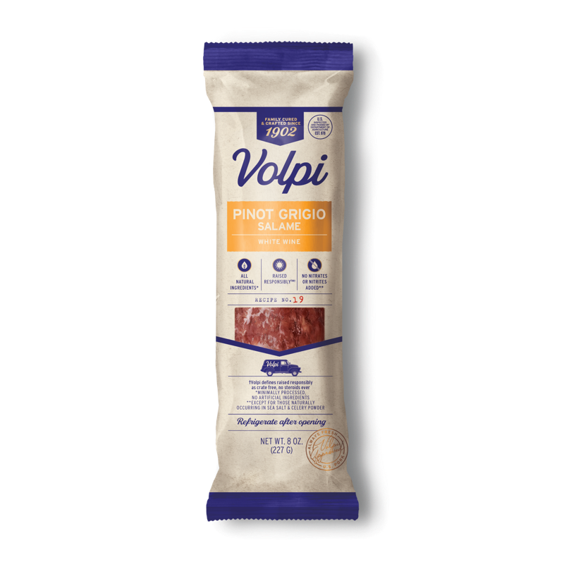 Made With White WineOur Pinot Grigio salame is made naturally* by hand with Pinot Grigio, love and time.