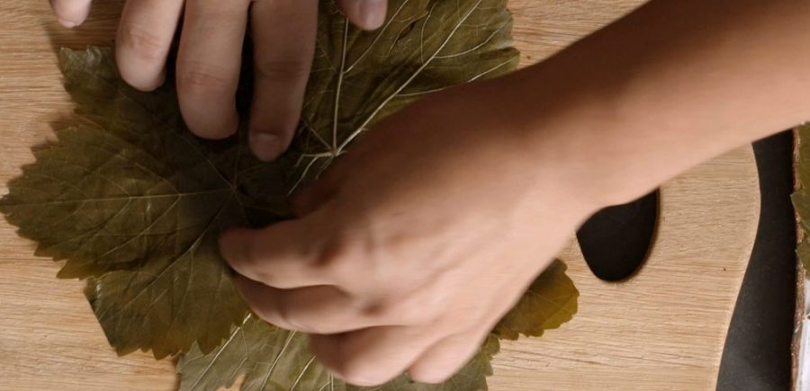 Cover the grape leaves with cold water and soak for 5 minutes. Drain, and pat dry. If the stems are too thick, cut them out. Lay 4-5 leaves on a work surface, stem side in the center, overlapping in a circle to create a circle of grape leaves. Repeat with the remaining leaves to create a second circle.