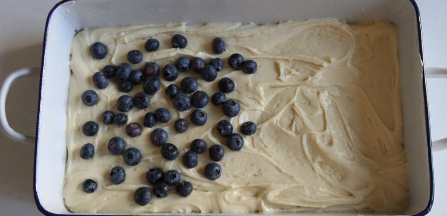 Spread the cake batter evenly in the prepared pan and scatter the blueberries over. Using your fingers, sprinkle the crumb topping in small patches over the blueberries.