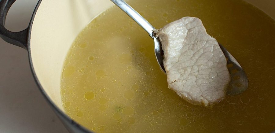 When the stock is simmering, add the marinated pork slices, discarding the marinade, and poach until just cooked, 3 to 4 minutes. Transfer to the plate with the spinach. Keep the stock at a simmer and add the noodles, gently stirring to separate them. When the noodles are soft, 2 to 3 minutes, remove and divide evenly the noodles and broth among four individual soup bowls.