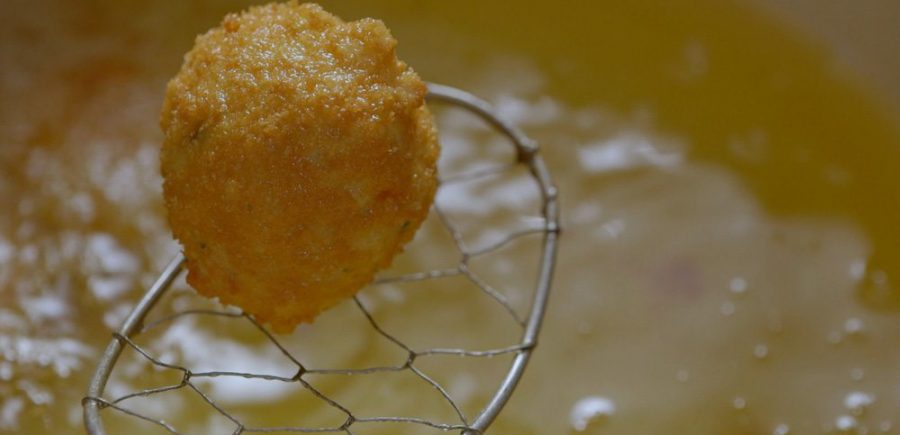 Hailing from Southern Italy, these stuffed, deep-fried rice balls have been served as street food for centuries. The stuffings vary and can include anything from cheese, cured meats, and peas, as below, to meat ragu or eggplant and capers. It’s a great use of leftover rice or risotto. Our version gives a light and crispy crust with a melty center and nuggets of salty meat. Italian teenagers will snack on these while casually leaning against their motorini, scoping out the scene. Grab one of these, and you become cool by association. Get your snack on, and do it while they’re hot.