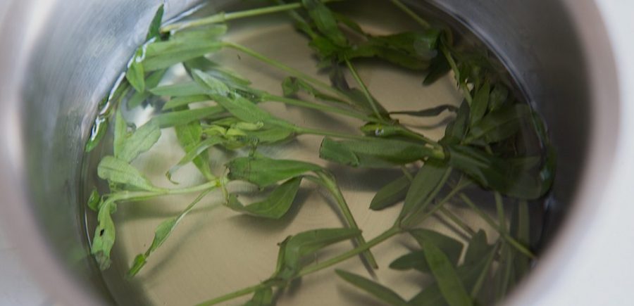 Drop fresh tarragon into a large pitcher. Use the handle of a wooden spoon to muddle the tarragon lightly, bruising it enough to release oils, but not crushing it.